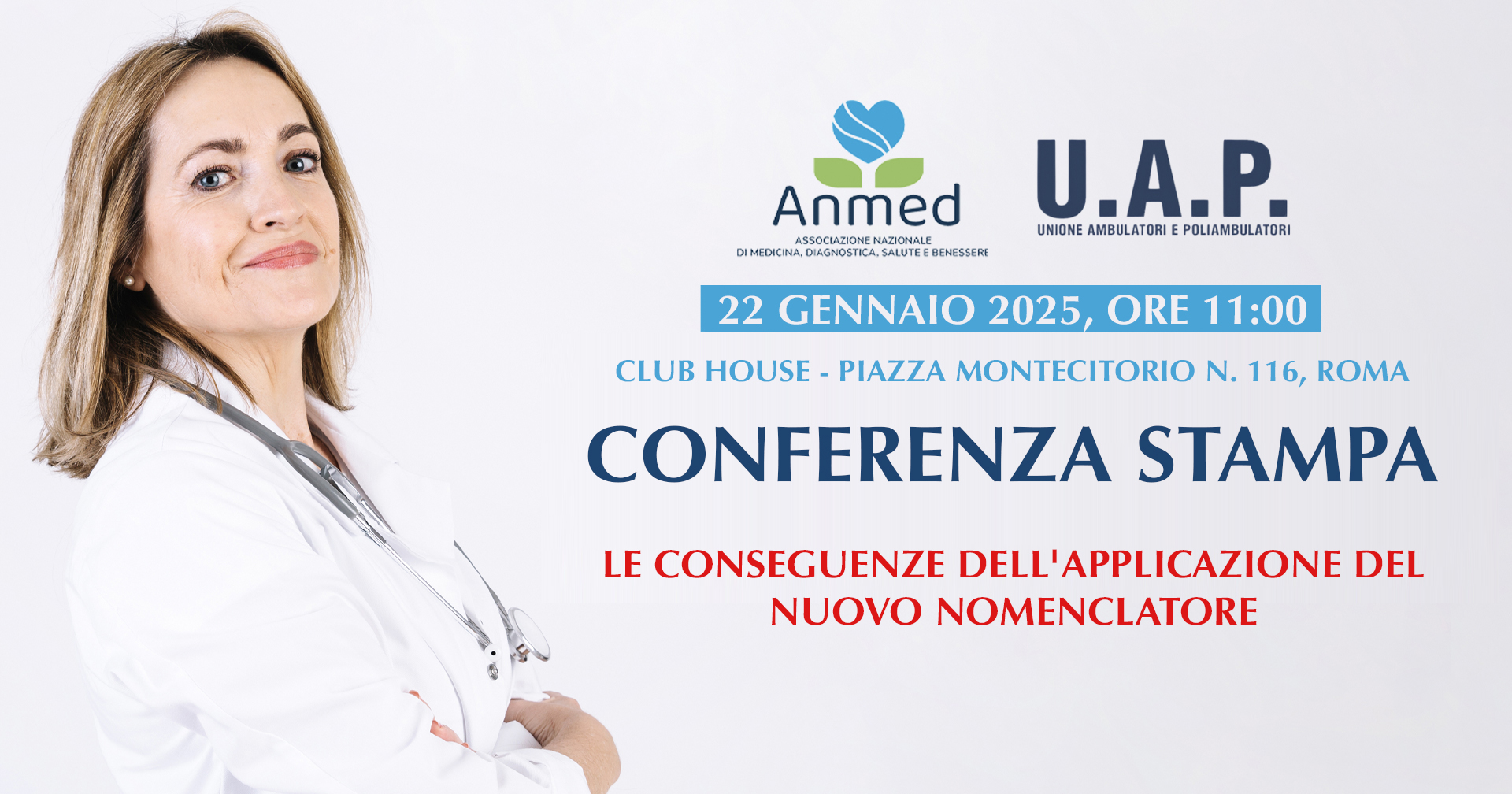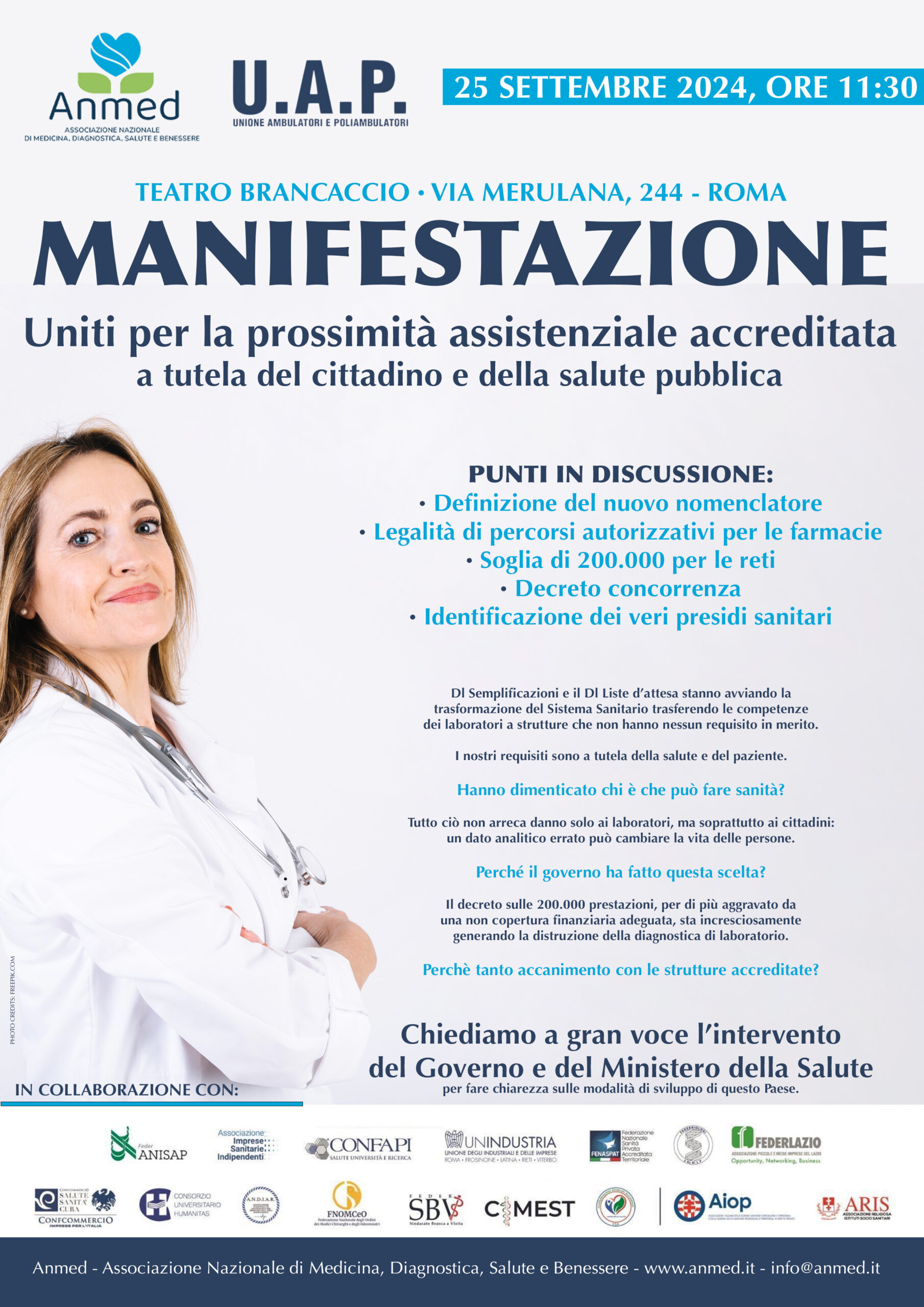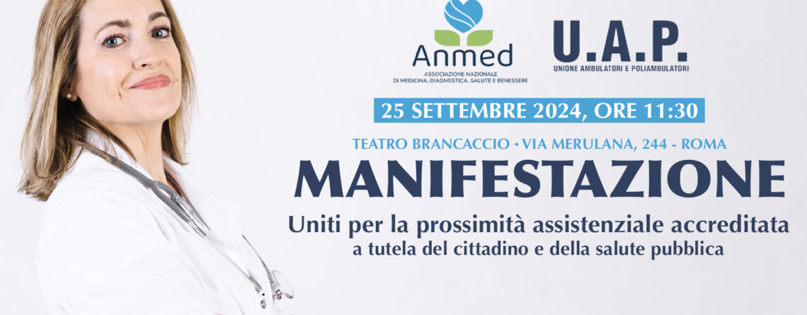 Anmed (Associazione Nazionale di Medicina, Diagnostica, Salute e Benessere) e UAP (Unione Ambulatori e Poliambulatori) indicono una manifestazione pubblica presso il Teatro Brancaccio sito in via Merulana 244 a Roma per giorno 25 settembre alle ore 11:30.