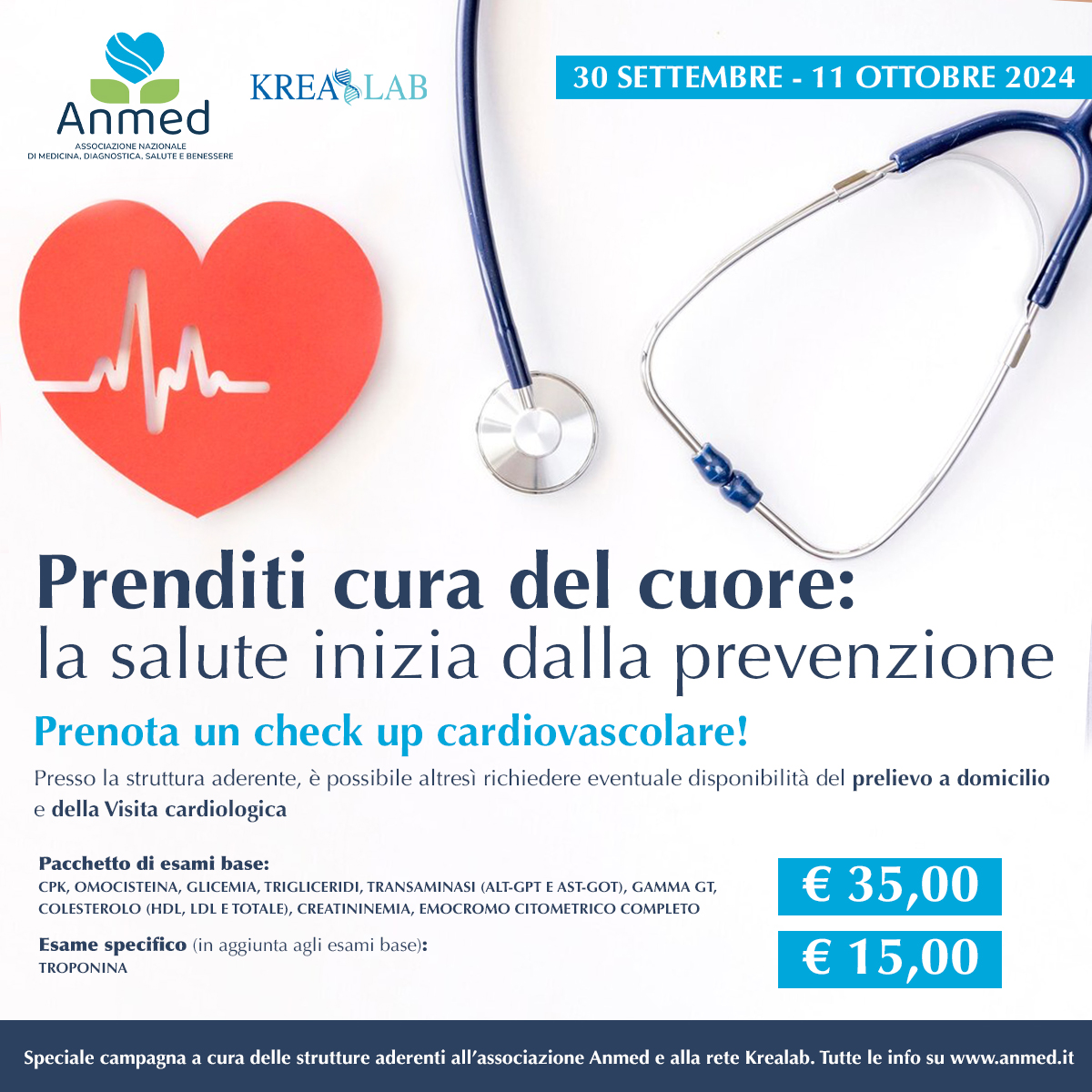 I laboratori aderenti ad Anmed – Associazione Nazionale di Medicina, Diagnostica, Salute e Benessere propongono per questa campagna di prevenzione i seguenti esami ad un prezzo speciale:
